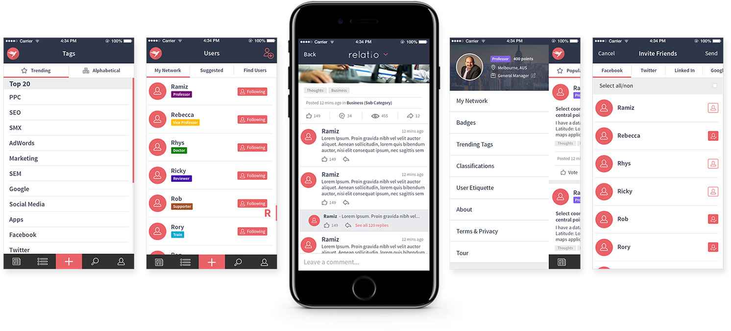 The app allows users to customise their Gambit Feed by subscribing to sub-classifications and follow other users on Relatio. The Gambit feeds can also be filtered to display Funny, Useful and/or News related Gambits. Gambits can also be displayed as popular, latest or by the most voted for.